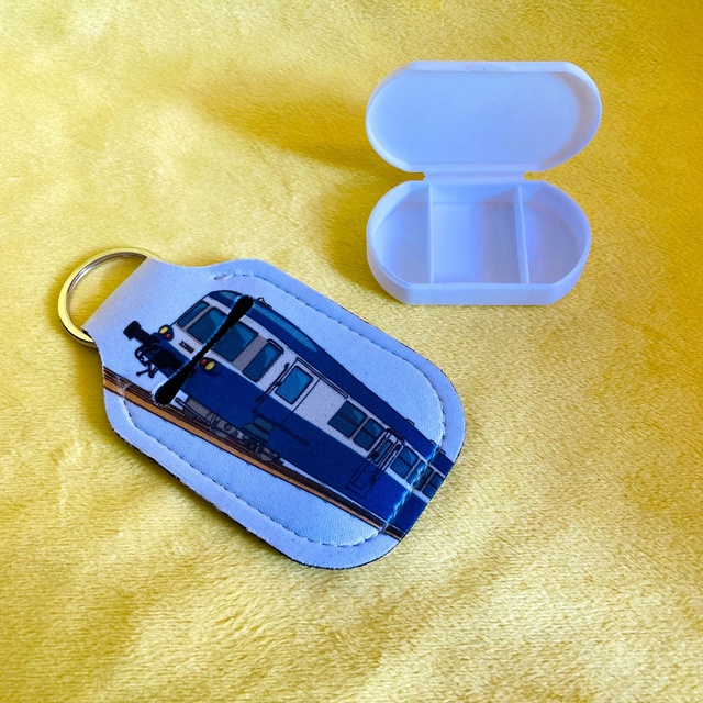 Voici un porte clé en néoprène avec une fente pour ranger le pilulier à 3 compartiments (inclus).
